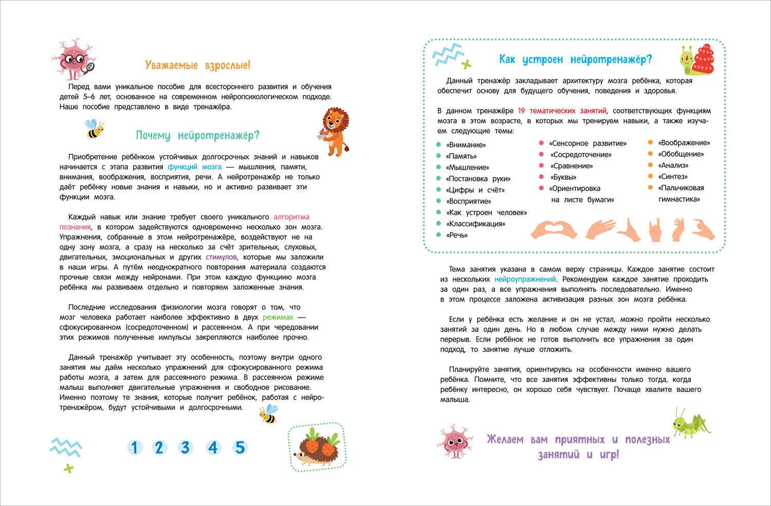 В этом пособии собраны нейроупражнения для детей 5–6 лет. С их помощью ребенок освоит азы таких важных навыков и знаний, как сосредоточение, мышление, речь, классификация, счет, память, внимание, восприятие, сенсорное развитие, части тела человека, постановка руки.