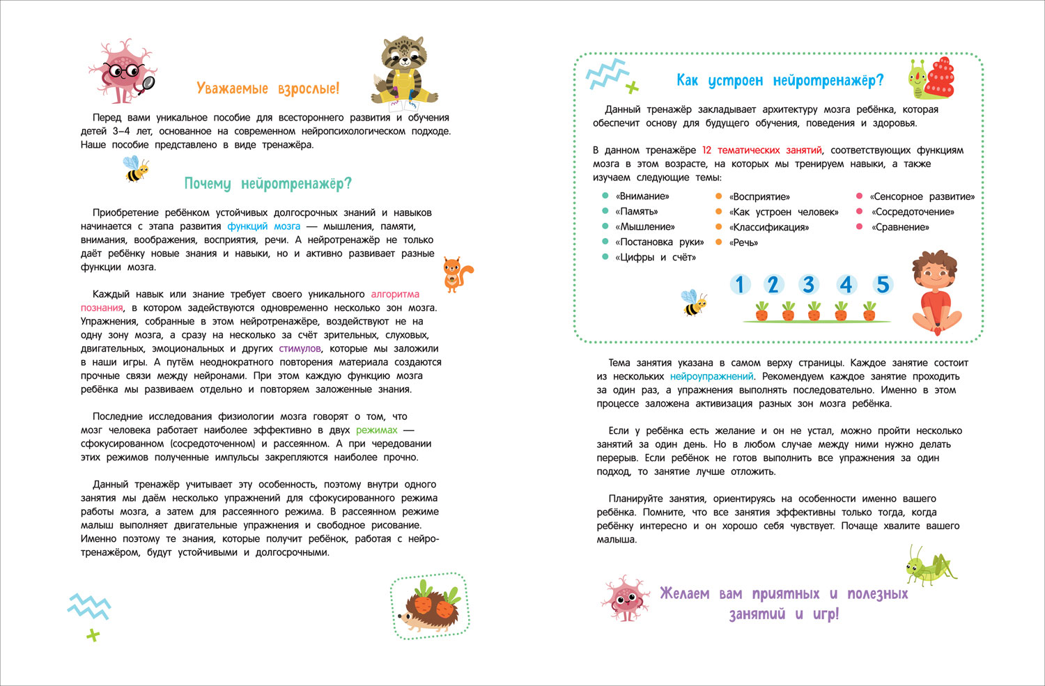 В этом пособии собраны нейроупражнения для детей 3–4 лет. С их помощью ребенок освоит азы таких важных навыков и знаний, как сосредоточение, мышление, речь, классификация, счет, память, внимание, восприятие, сенсорное развитие, части тела человека, постановка руки.