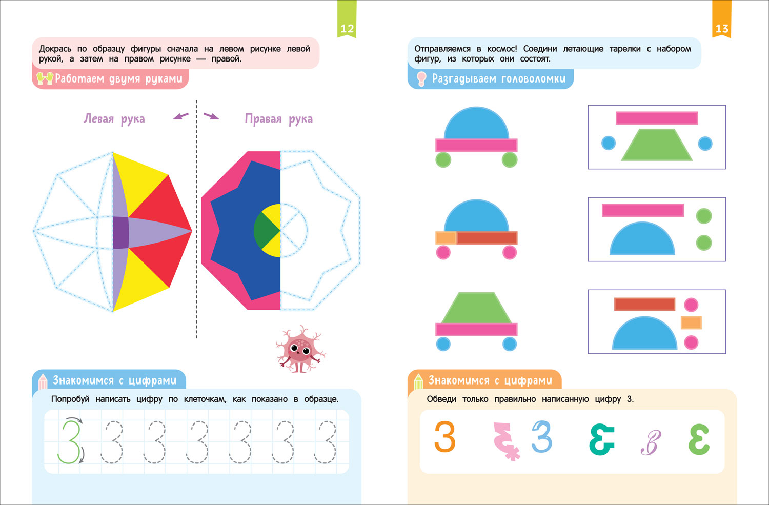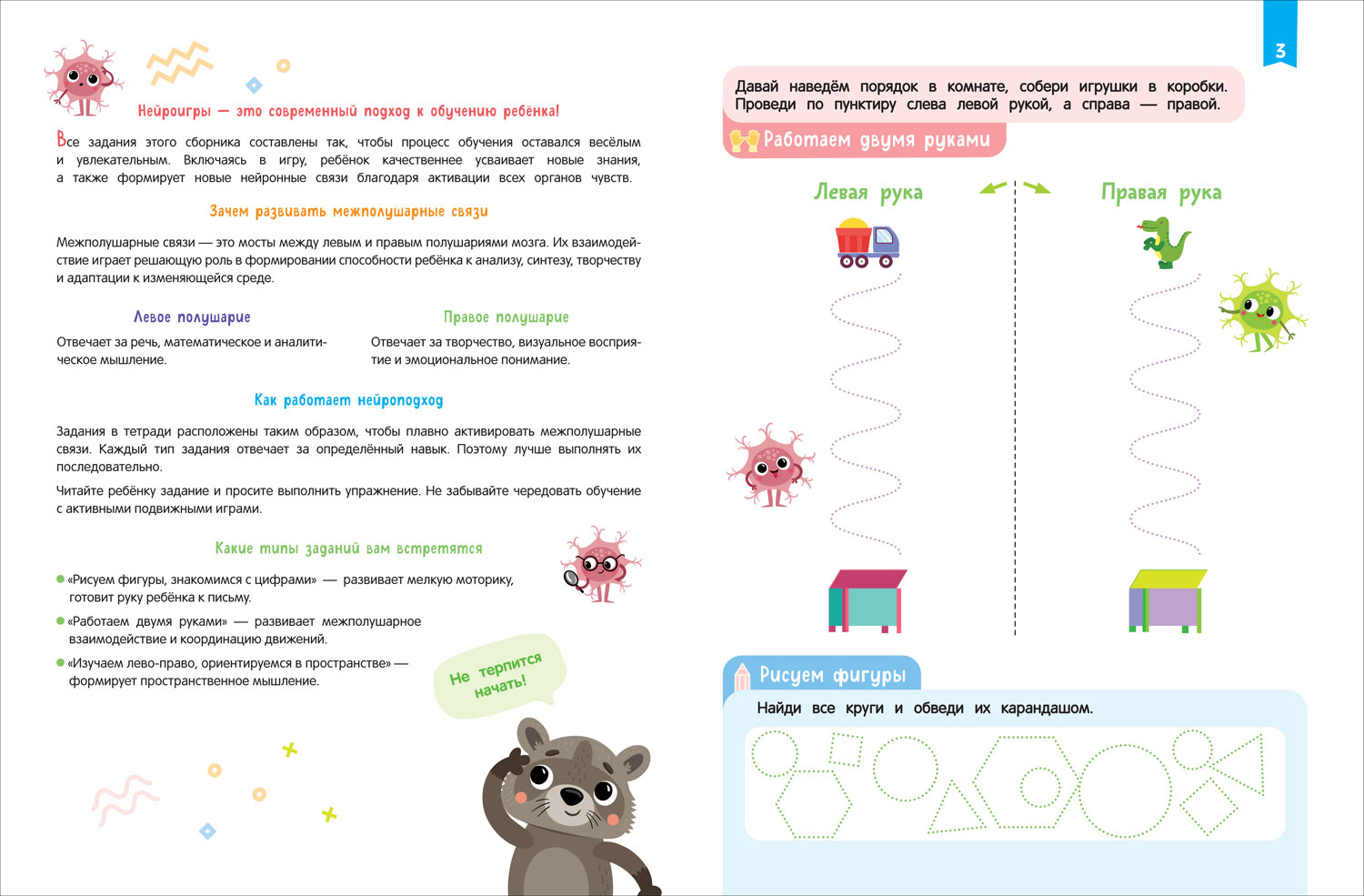 В этом пособии собраны нейроупражнения для детей 4–5 лет. С их помощью ребенок в легкой игровой форме познакомится с фигурами и цифрами от 0 до 9. А современная эффективная нейрометодика поможет ему быстро научиться различать право и лево и работать двумя руками, активируя межполушарные связи.