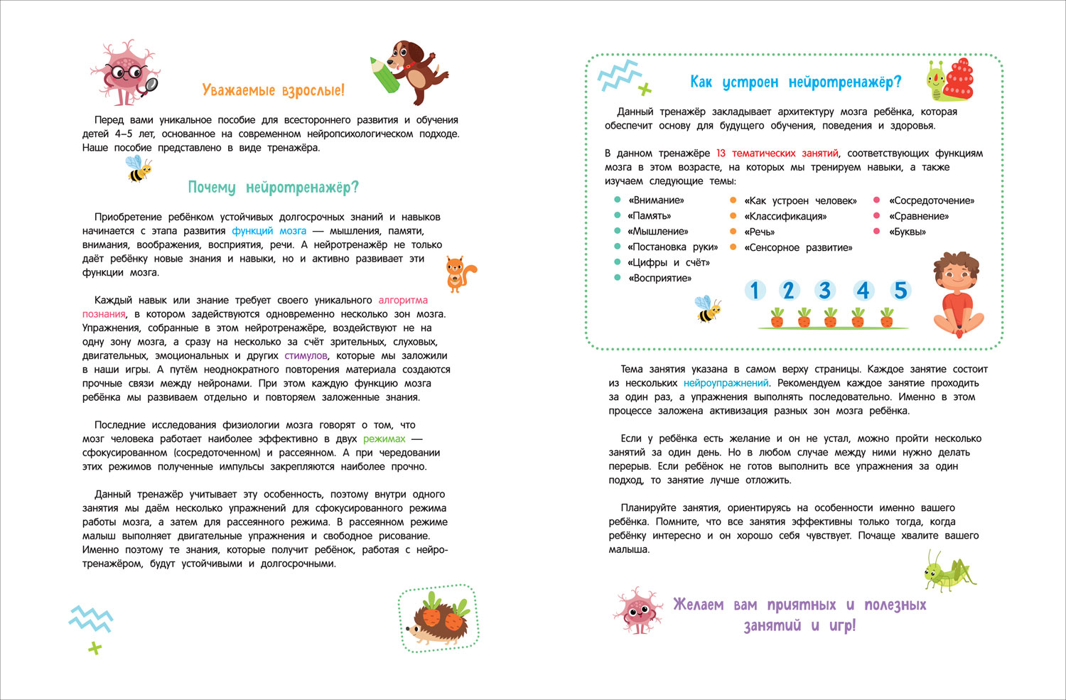 В этом пособии собраны нейроупражнения для детей 4–5 лет. С их помощью ребенок освоит азы таких важных навыков и знаний, как сосредоточение, мышление, речь, классификация, счет, память, внимание, восприятие, сенсорное развитие, части тела человека, постановка руки.